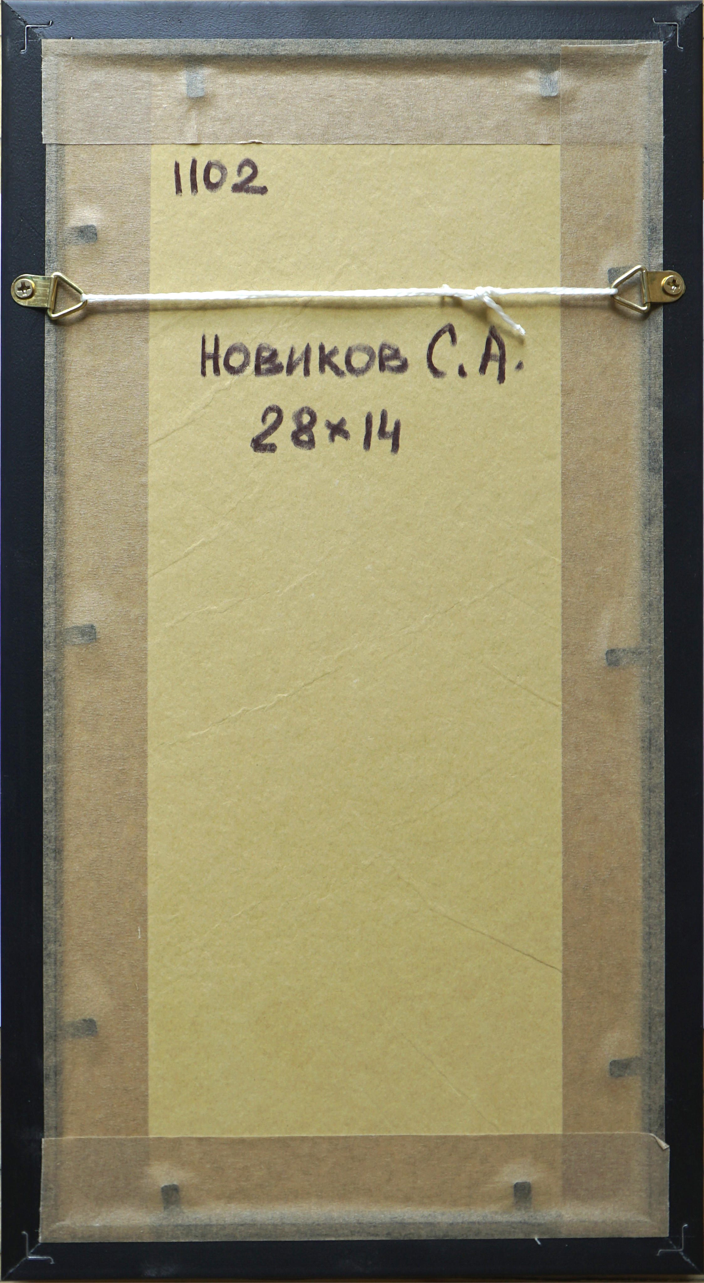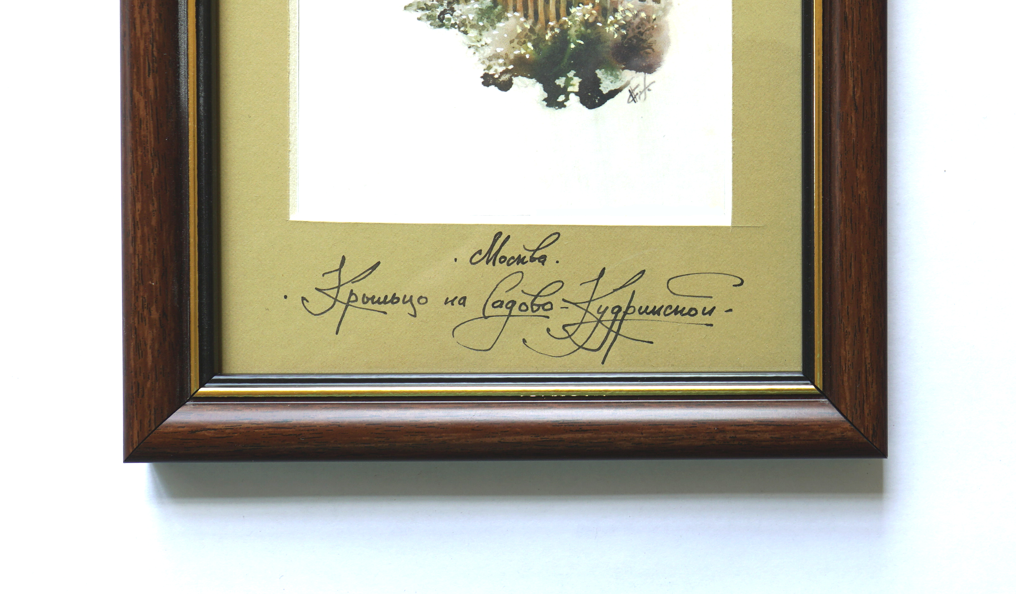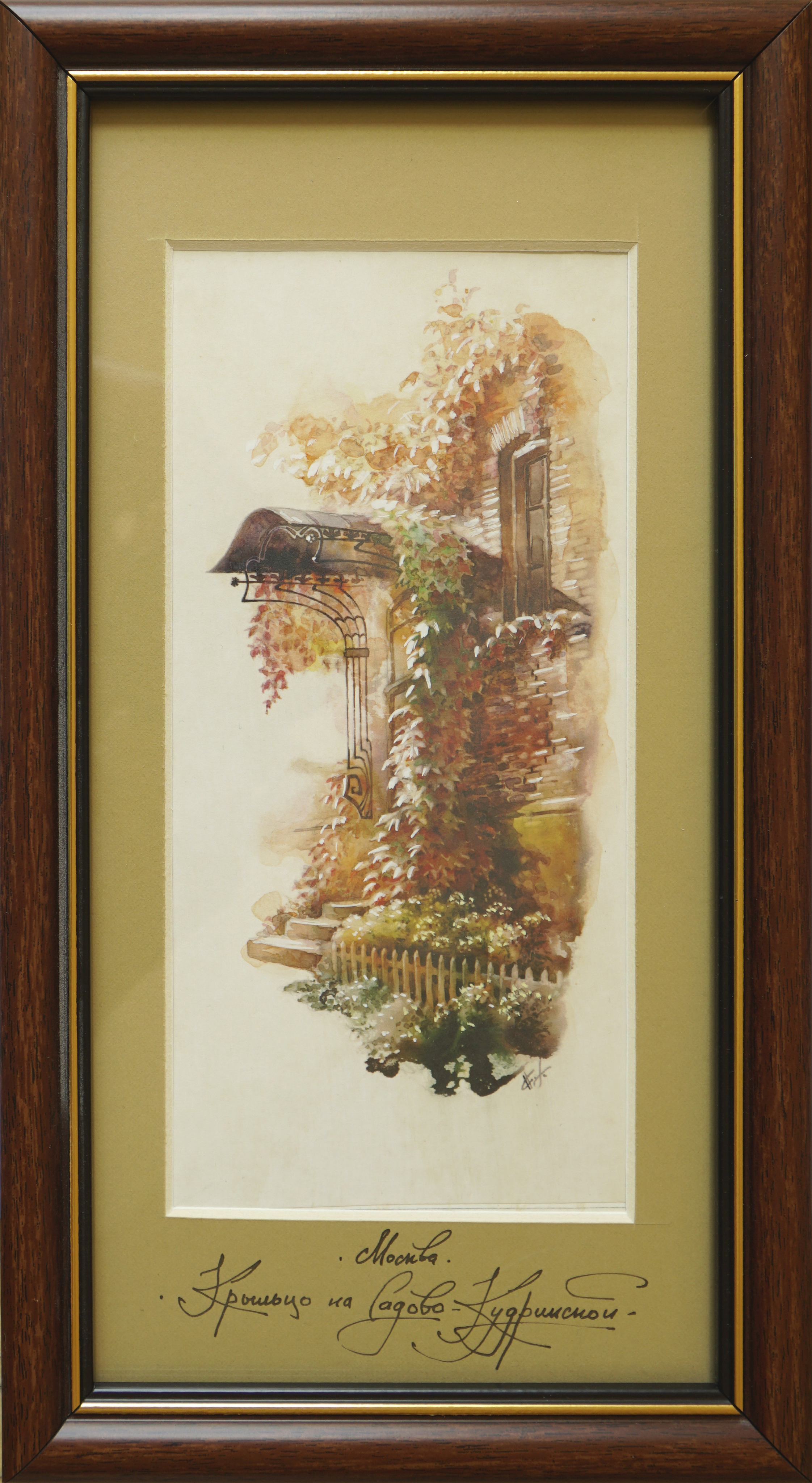 Это серия акварельных картин под общим названием "Московские дворики". Картина выполнена в технике акварель, с применением темперы, имеет артикул 1102. Оформлена в классическом стиле, в коричневой рамке, под стеклом, с бежевым паспорту. Этот сюжет нарисован как миниатюра, имеет маленький размер, по внешнему периметру рамы 31*17 см, но в дополнение к этому формату, существуют другие серии: панорамы 0100 - 57*25, квадратные 0200 - 31*43, вертикальные 1100 - 31*17, большие 0300 - 60*37, цветы 1000 - 17*42. В каждой серии по нескольку сюжетов от 6 до 25. Они разные по цвету графике, но объединены одной манерой исполнения, и одним стилем оформления, поэтому все картины дополняют одна другу.