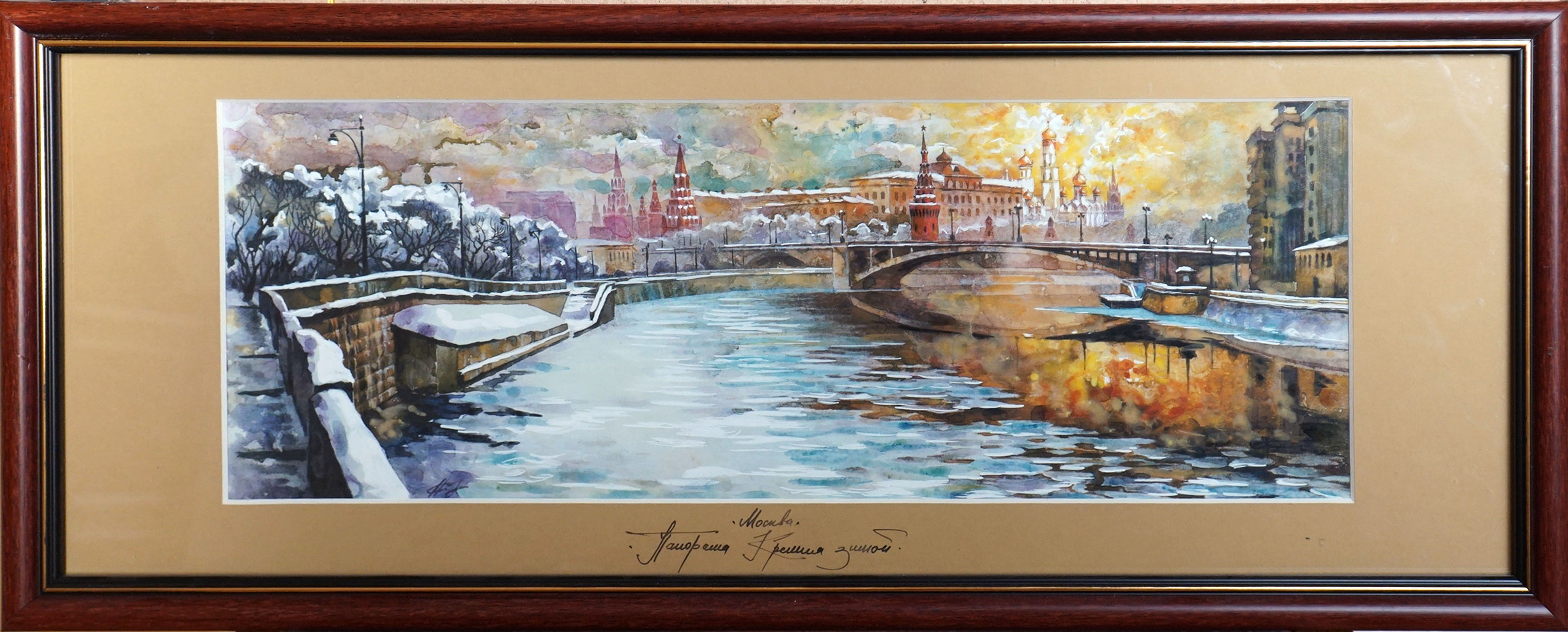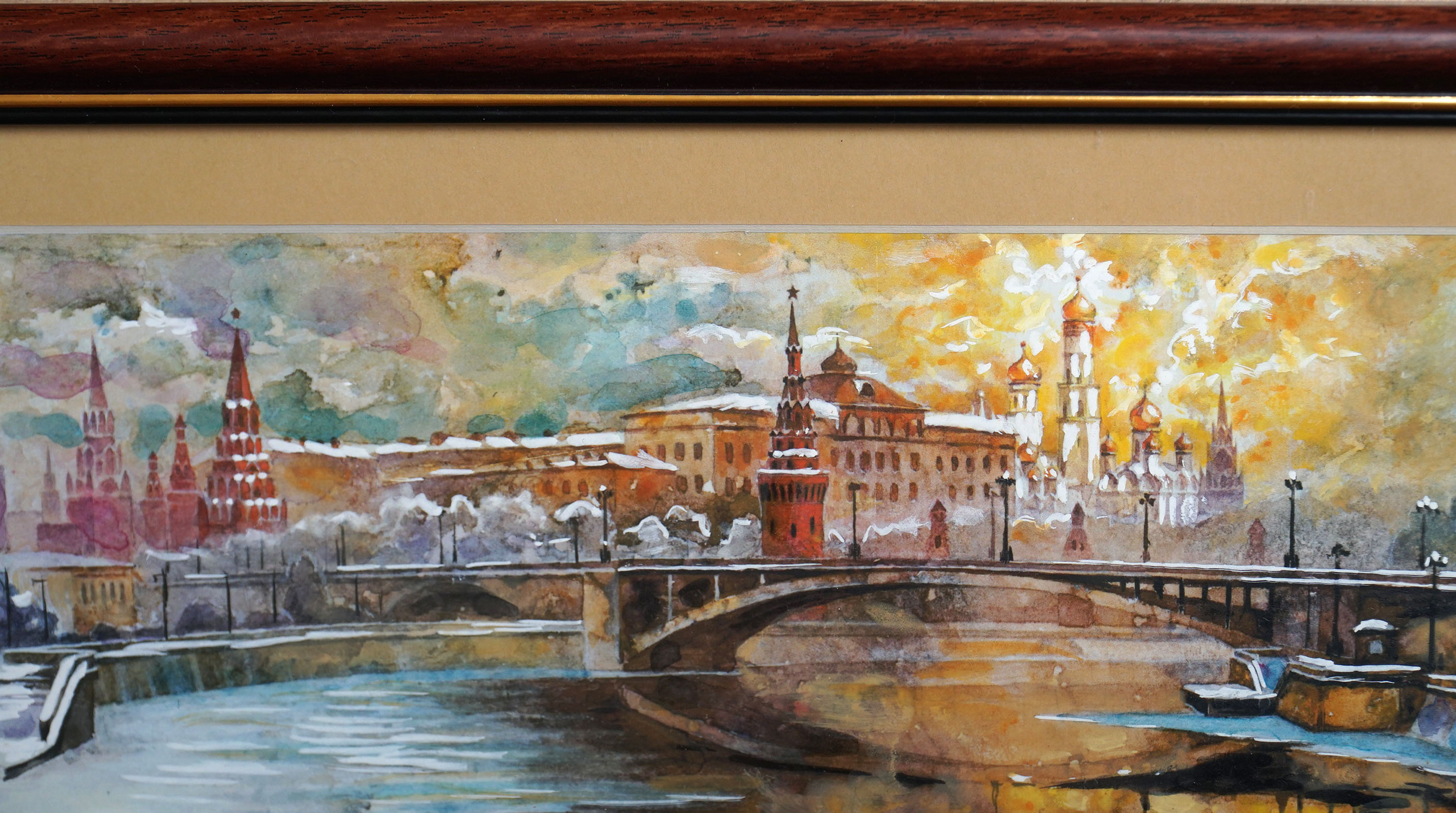 Авторская акварельная композиция передает атмосферу московской зимы с нотками романтики и традиций. Изображение выполнено в мягких бежевых оттенках, дополняемых натуральным коричневым багетом и воздушным паспарту, подчеркивающим объемность картины.