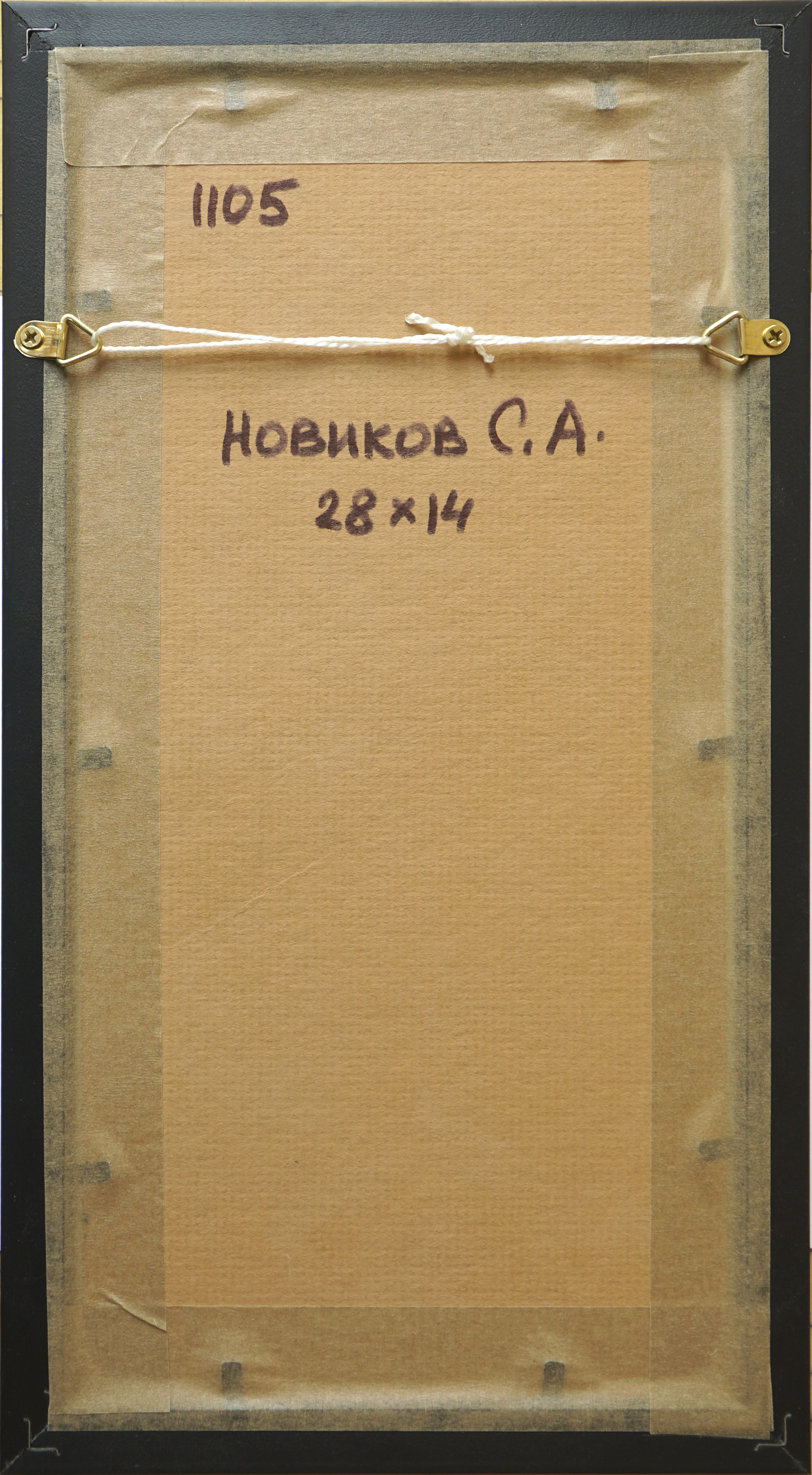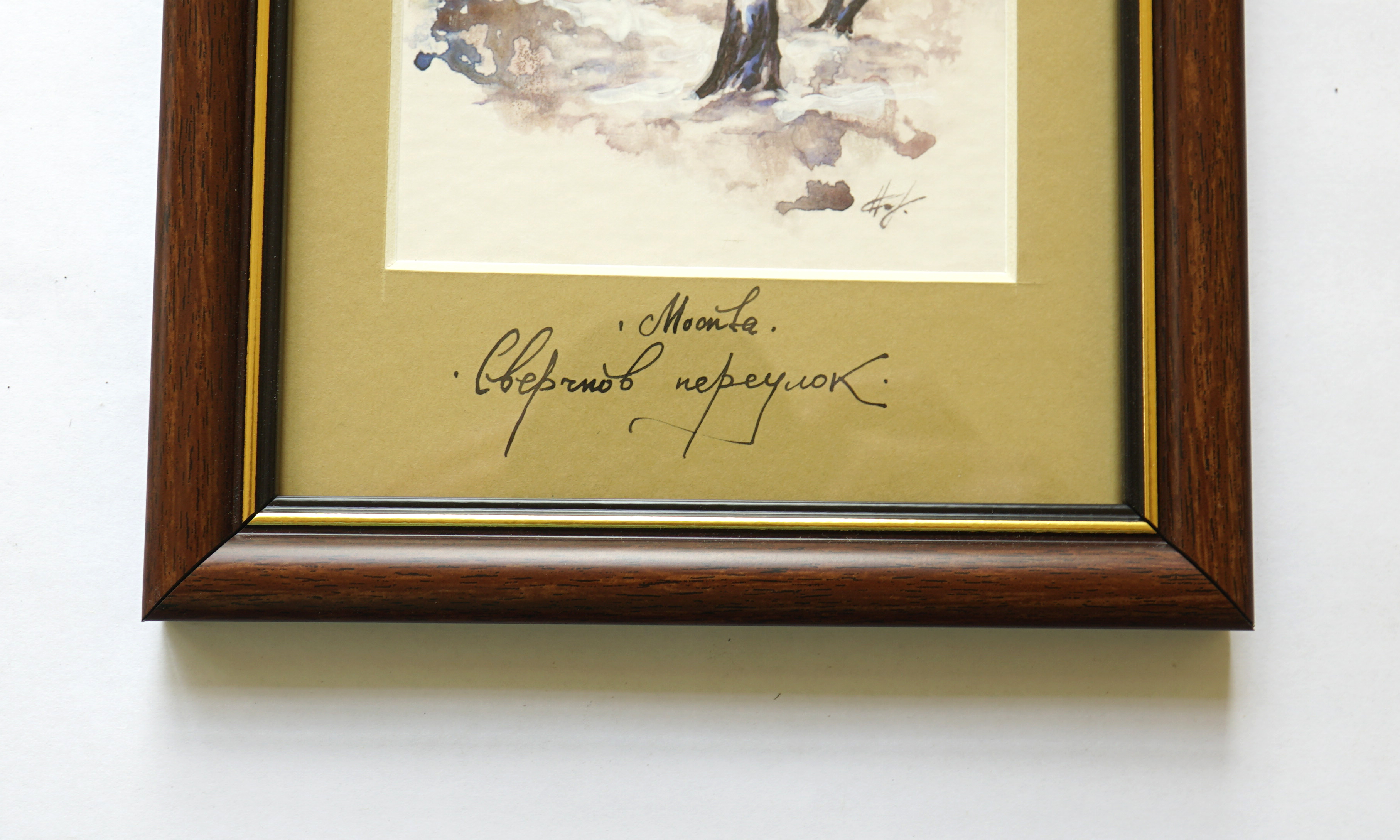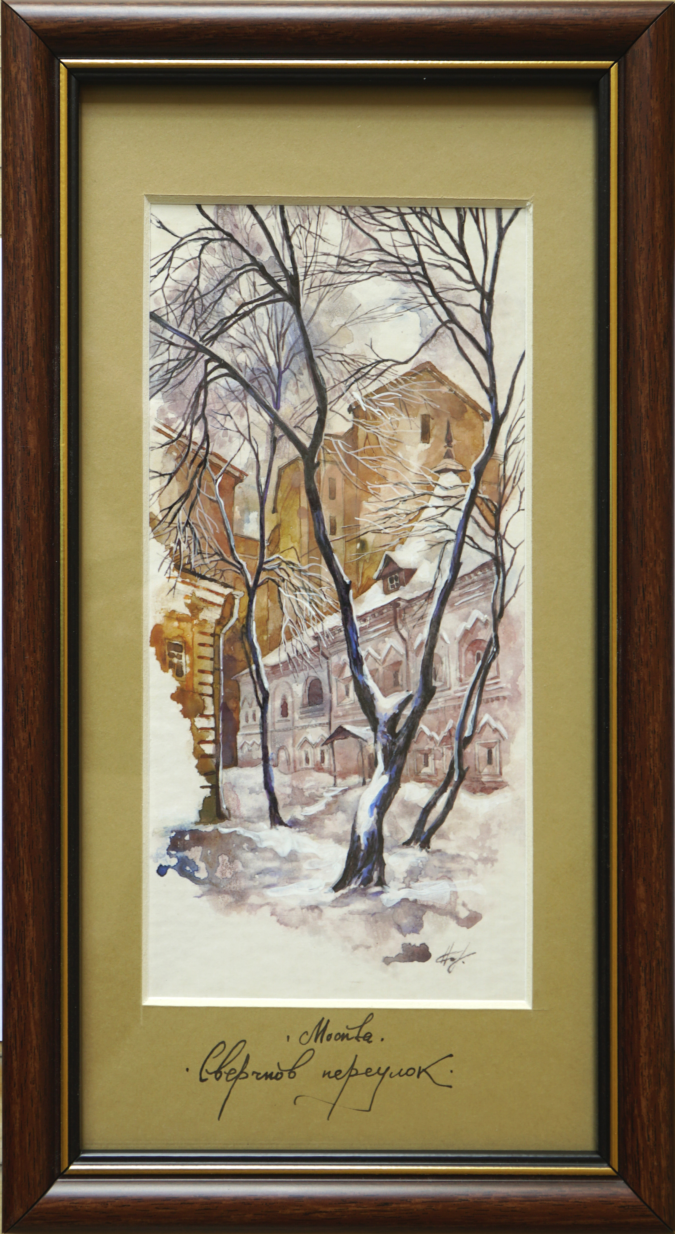 Это серия акварельных картин под общим названием "Московские дворики". Картина выполнена в технике акварель, с применением темперы, имеет артикул 1105. Оформлена в классическом стиле, в коричневой рамке, под стеклом, с бежевым паспорту. Этот сюжет нарисован как миниатюра, имеет маленький размер, по внешнему периметру рамы 31*17 см, но в дополнение к этому формату, существуют другие серии: панорамы 0100 - 57*25, квадратные 0200 - 31*43, вертикальные 1100 - 31*17, большие 0300 - 60*37, цветы 1000 - 17*42. В каждой серии по нескольку сюжетов от 6 до 25. Они разные по цвету графике, но объединены одной манерой исполнения, и одним стилем оформления, поэтому все картины дополняют одна другу.