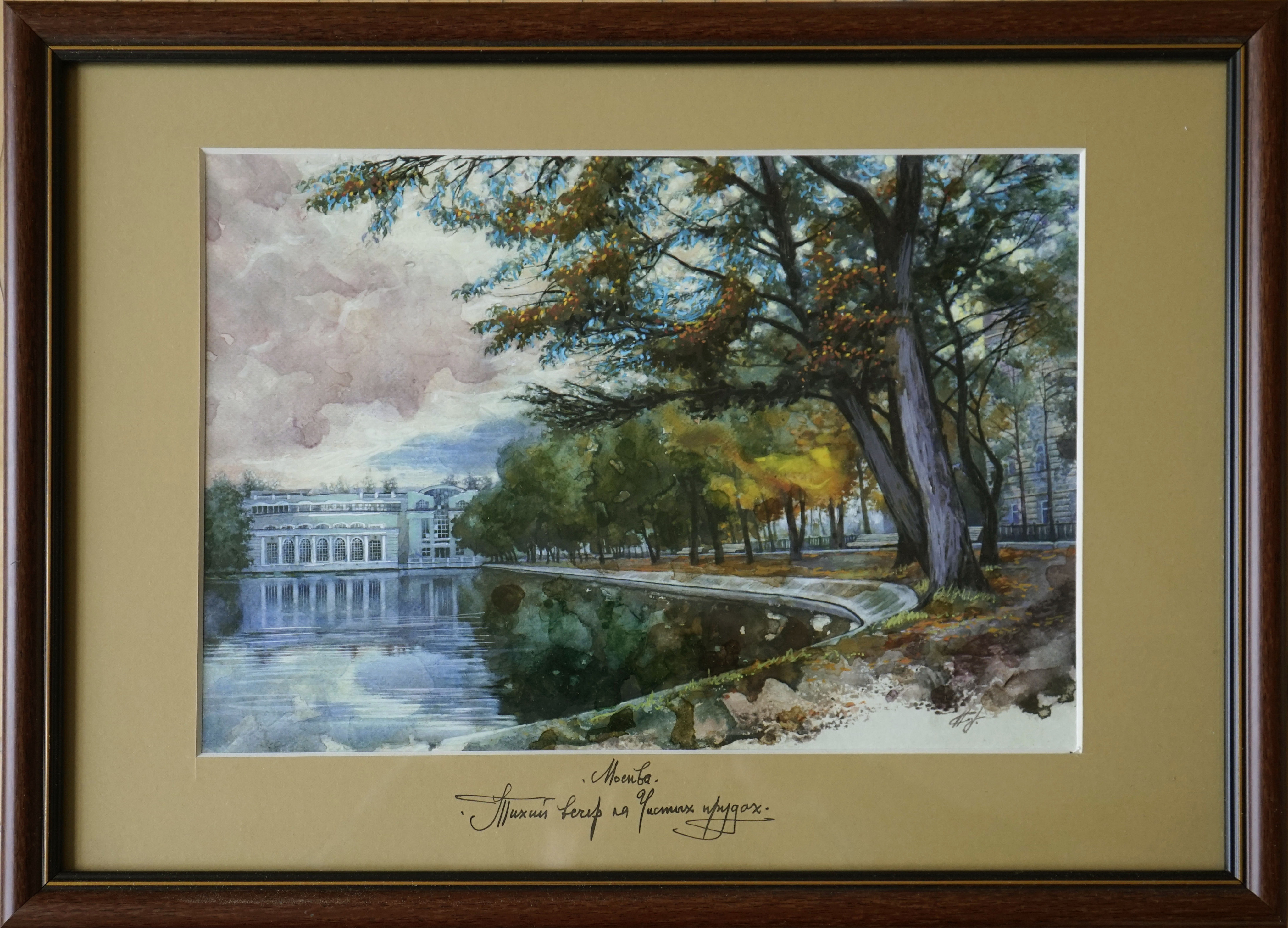 "Тихий вечер на чистых прудах" — оригинальная акварельная композиция, созданная художником вручную. Яркие голубые тона воды и неба гармонично сочетаются с теплым коричневым деревянным багетом, дополненным паспарту. Размеры 43×31 см идеально подходят для интерьера, добавляя пространству легкости и уюта.