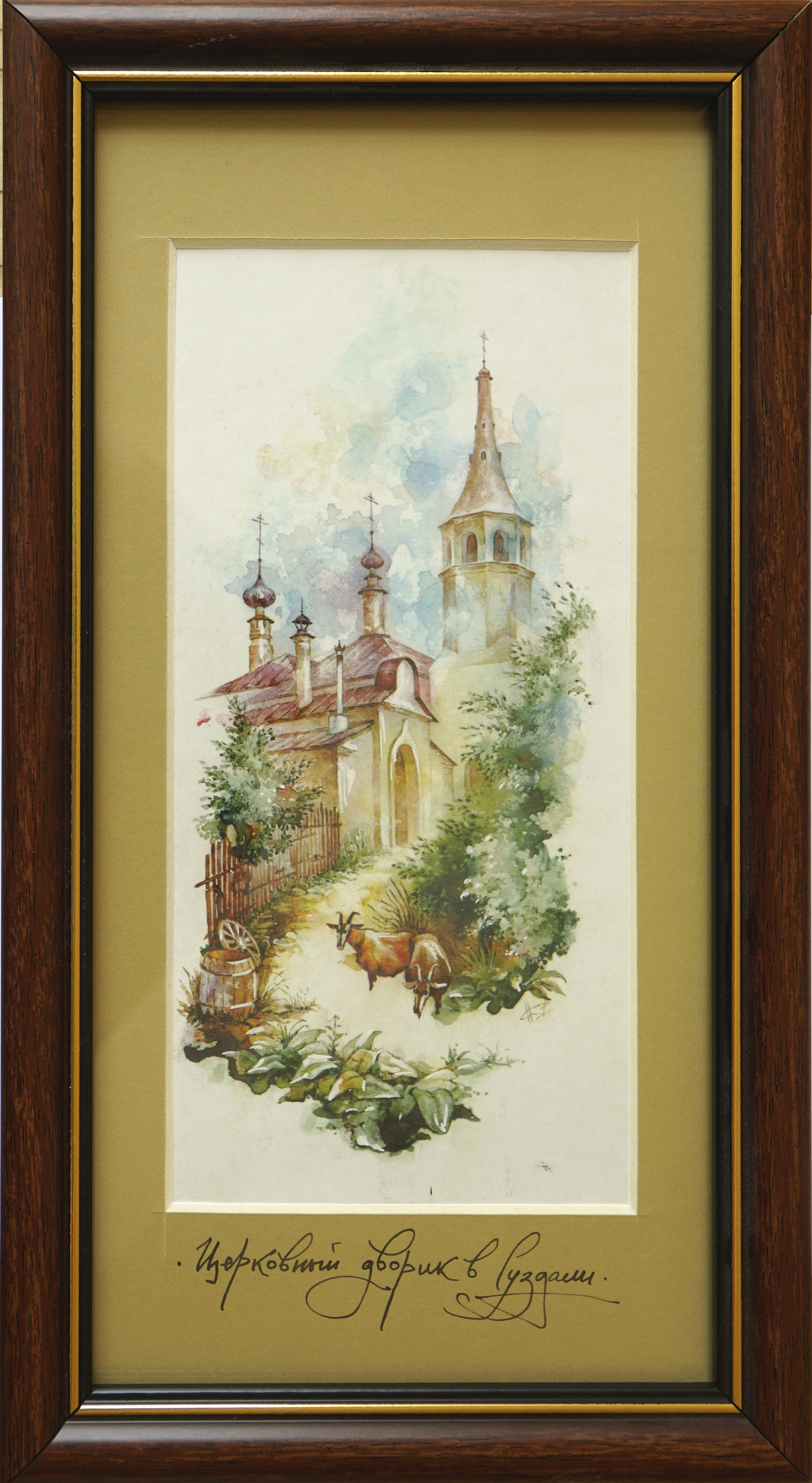 Акварельная картина "Церковный дворик в Суздали" показывает летний день в провинциальном городе, где идет неспешная жизнь со своими атрибутами; пасущиеся то там то сям козы, кусты , лопухи, заборчики, сломанные деревянные колёса, и всё это на фоне красивейшей архитектуры Русского шатрового зодчества. Людей в пейзаже нет, но есть незримое их присутствие, ещё немного и кто-то пройдет по этой еле заметной тропинке.
