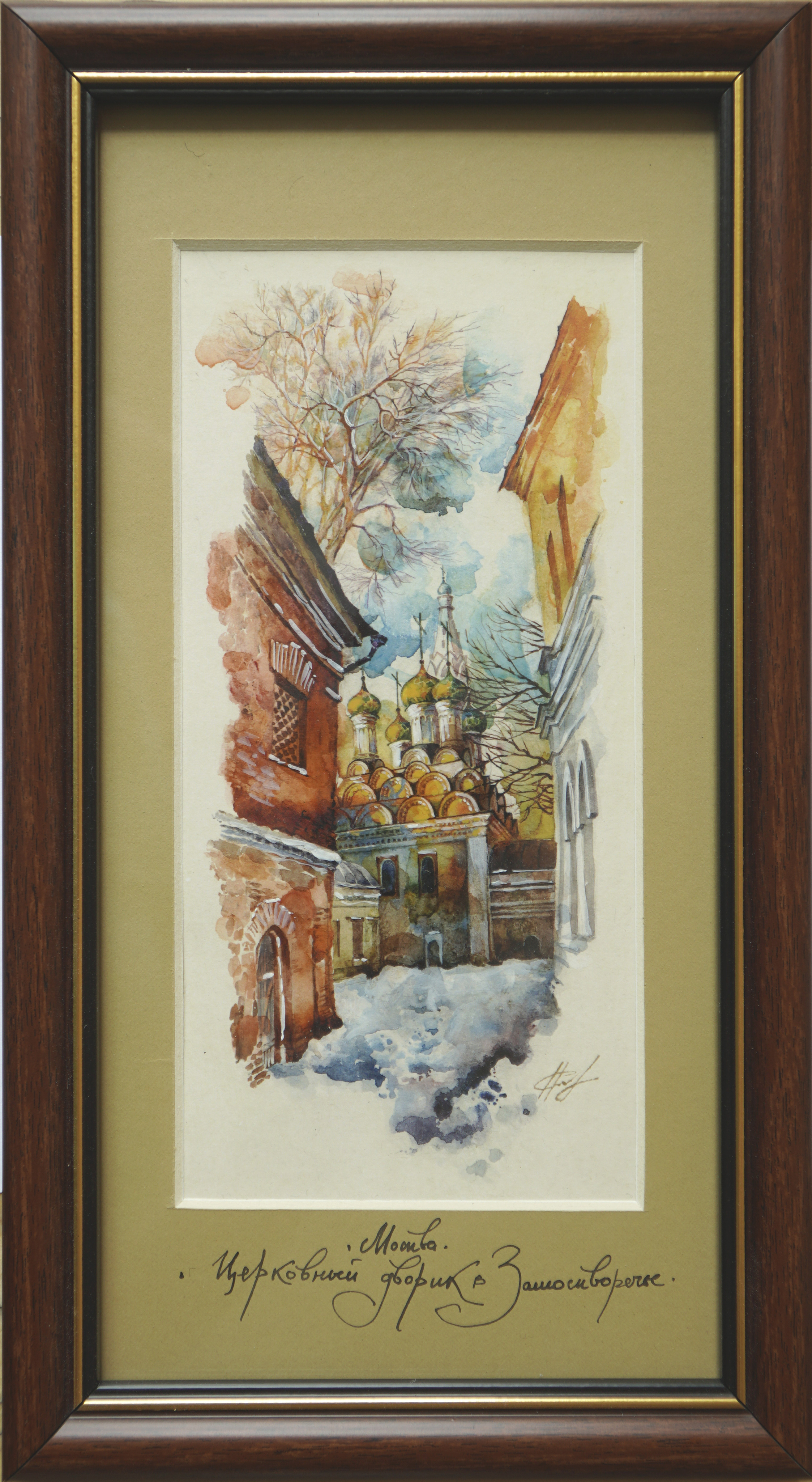 Сюжет акварельной картины "Церковный дворик в Замоскворечье" рассказывает о небольшом тесном Замоскворецком дворике, к тому же засыпанным снегом. Солнечный, морозный, январский свет осветил купола старинной церкви построенной на рубеже 16 и 17 веков, ещё при Борисе Годунове, с рядами полукруглых закомар и увенчанных пятью луковичными, богато украшенными главками и православными крестами. А вот в нижнюю часть двора свет не добрался, и там лежит снег с ярко синим и кобальтовым цветом сугробов, в контраст оранжевому, кирпичному, желтому цвету закомар и куполов. Тесный проход между домами, похоже того же времени или более позднего, заставляет поднять голову вверх, к ярко голубому небу, куда устремились из тесноты дворов городские тополя, ярко освещенные солнцем.