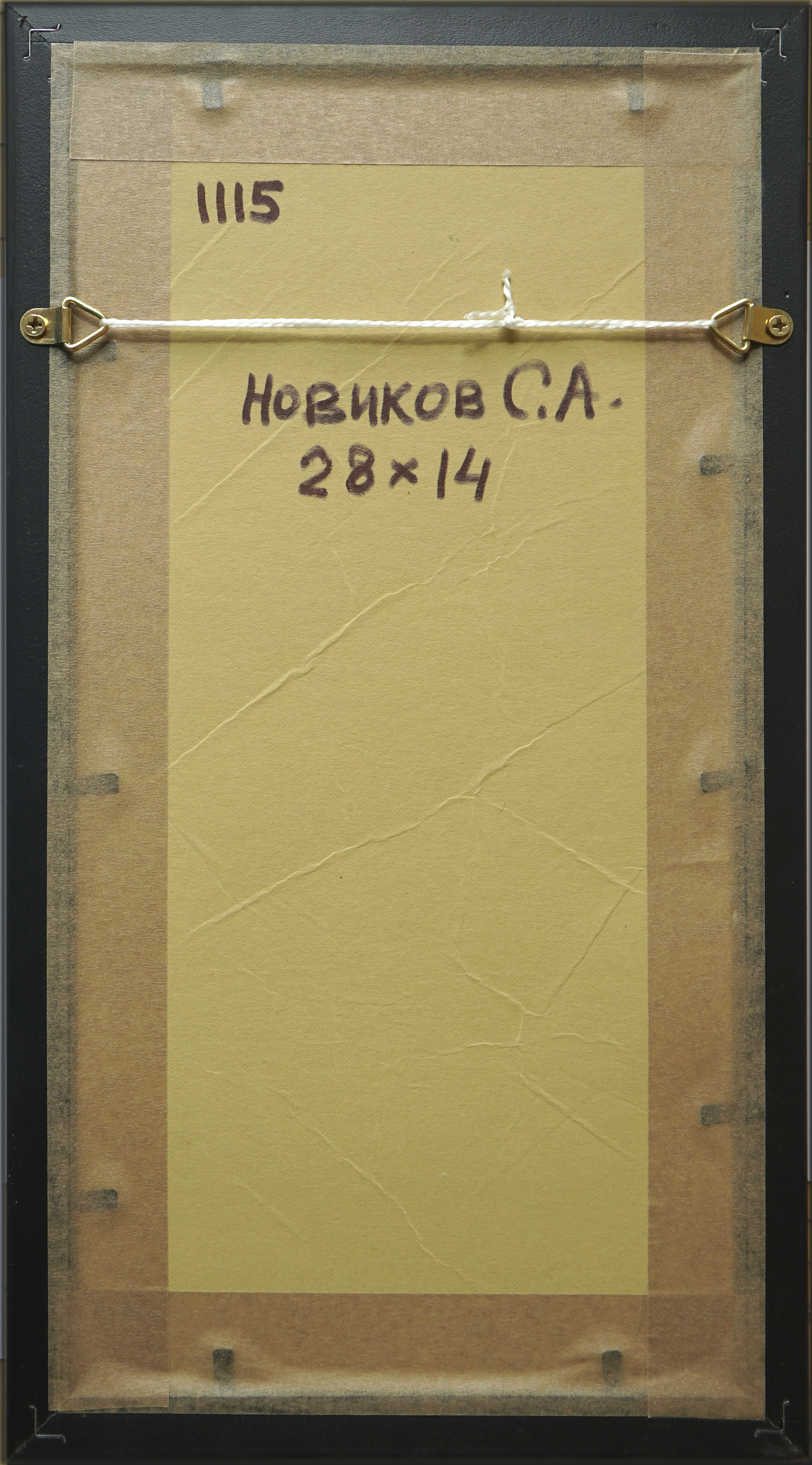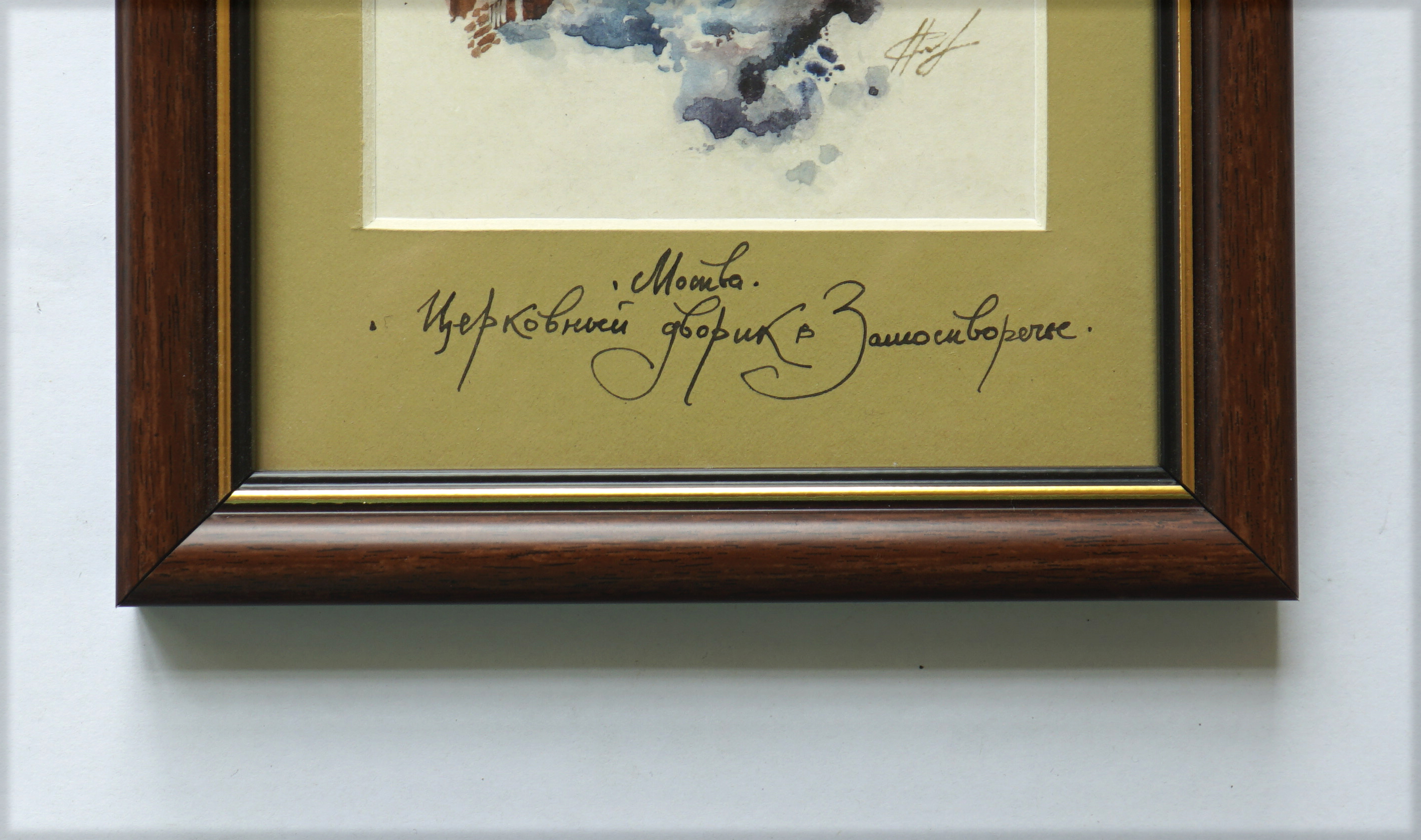 Это серия акварельных картин под общим названием "Московские дворики". Картина выполнена в технике акварель, с применением темперы, имеет артикул 1115. Оформлена в классическом стиле, в коричневой рамке, под стеклом, с бежевым паспорту. Этот сюжет нарисован как миниатюра, имеет маленький размер, по внешнему периметру рамы 31*17 см, но в дополнение к этому формату, существуют другие серии: панорамы 0100 - 57*25, квадратные 0200 - 31*43, вертикальные 1100 - 31*17, большие 0300 - 60*37, цветы 1000 - 17*42. В каждой серии по нескольку сюжетов от 6 до 25. Они разные по цвету графике, но объединены одной манерой исполнения, и одним стилем оформления, поэтому все картины дополняют одна другу.