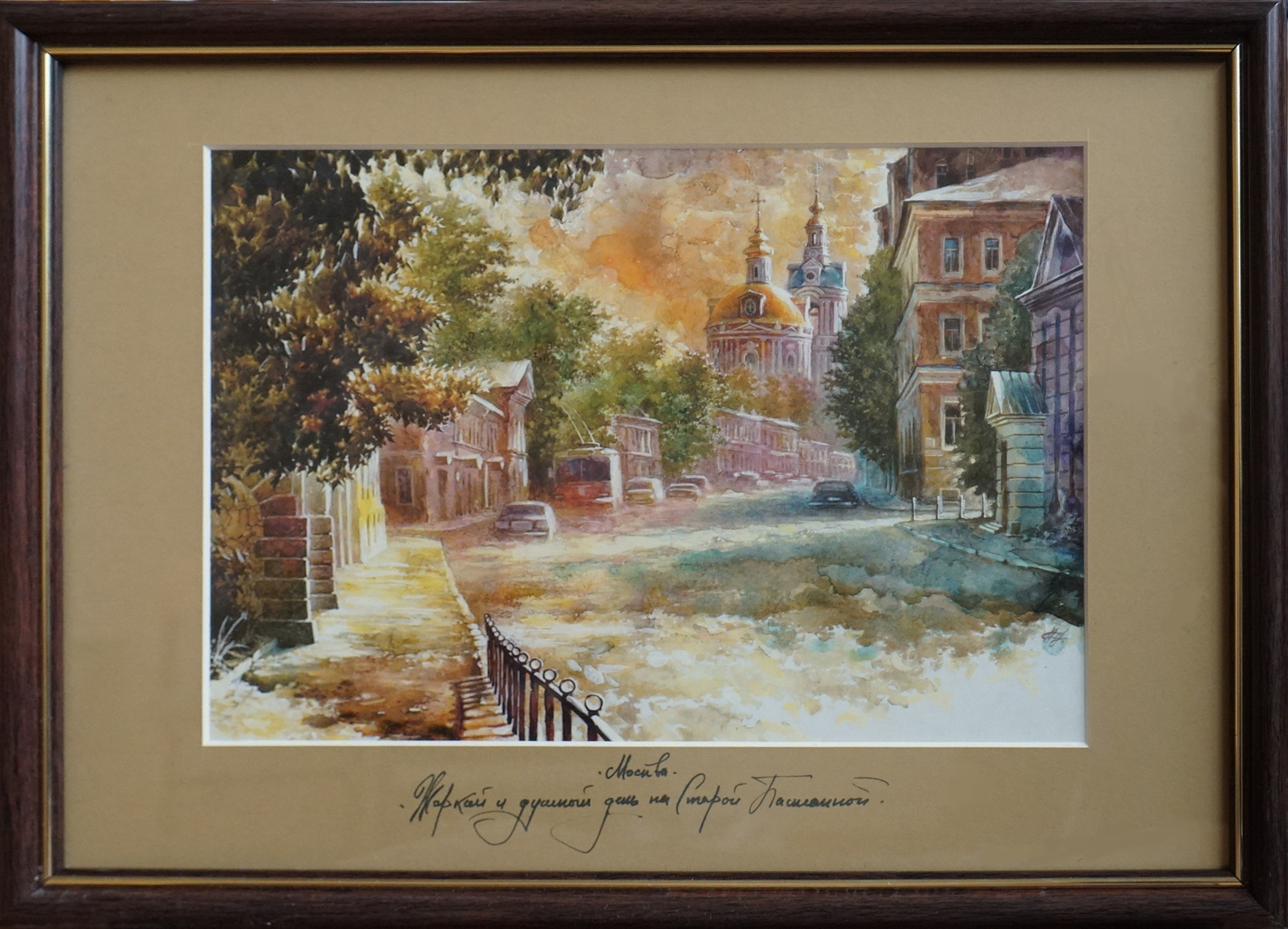 Эта акварельная живопись передает атмосферу старинного московского района с теплотой и детализацией. Авторская работа выполнена вручную, что делает ее неповторимой и идеальной для украшения интерьера или офиса.